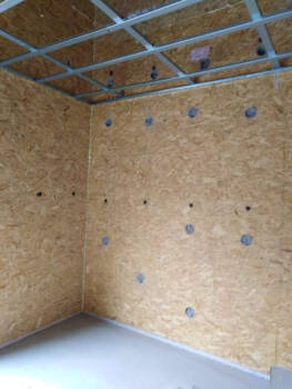 Vorteilhaft ist auch die Verwendung einer Installationszusatzschale. Nach dem Einbau der Verteilungsleitungen wird auf den Holzrost ein Spritzauftrag aus dem Dämmstoff aufgetragen, was die Akustik deutlich verbessert und den Wärmewiderstand der Konstruktion verbessert. Wenn die Zusatzschale in einer Dicke bis zu 6 cm installiert wird, ist es dank der natürlichen Fähigkeit des Zellulosedämmstoffes die Feuchtigkeit aktiv zu transportieren, nicht notwendig sich mit der Dampfbremsebene zu befassen (eine OSB-Platte in der Außenwand ist ausreichend).