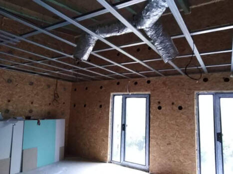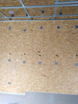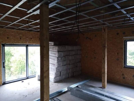 Die Zellulosedämmung Climatizer Plus sichert dank ihrer Rohdichte auch eine ausreichende Schalldämmung, aber an manchen Stellen des Hauses ist es notwendig andere Akustiklösungen zu verwenden. Bei einem Aufbau einer Holzbalkendecke werden mit hervorragenden Ergebnissen auch die ultradünnen Akustikplatten Wolf eingesetzt.
