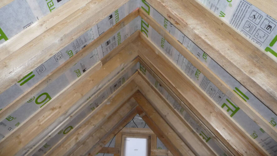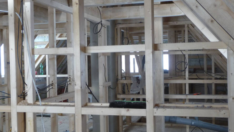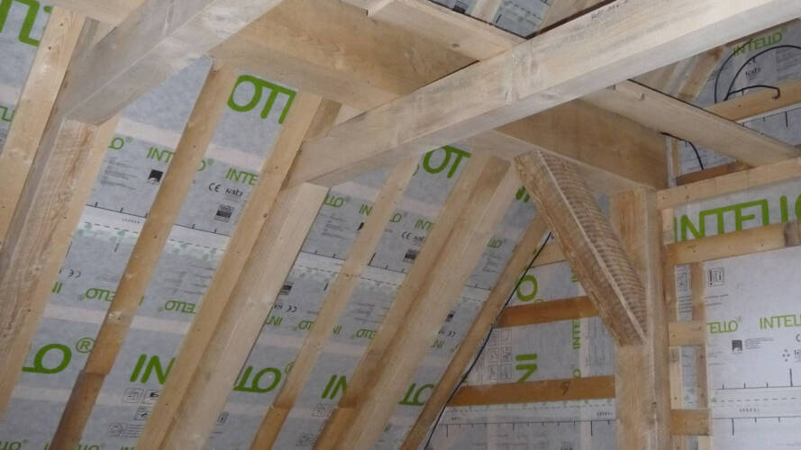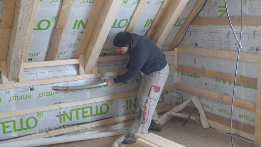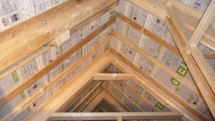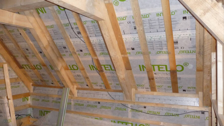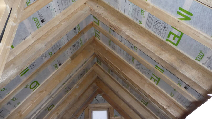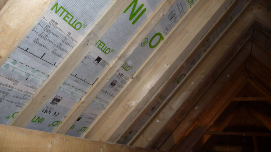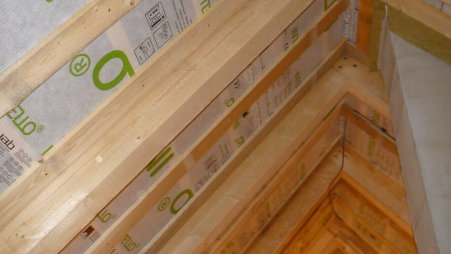 Die Zellulosedämmung Climatizer Plus sichert dank ihrer Rohdichte auch eine ausreichende Schalldämmung, aber an manchen Stellen des Hauses ist es notwendig andere Akustiklösungen zu verwenden. Bei einem Aufbau einer Holzbalkendecke werden mit hervorragenden Ergebnissen auch die ultradünnen Akustikplatten Wolf eingesetzt.