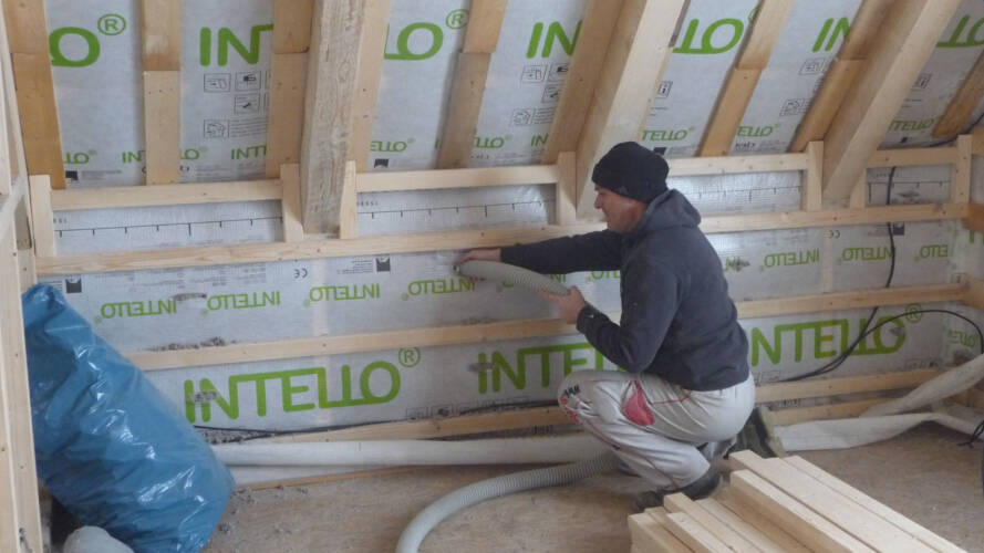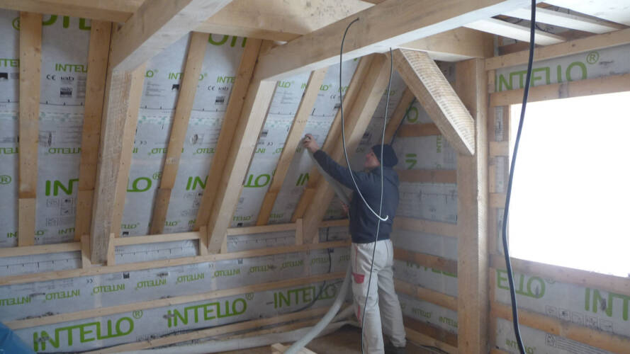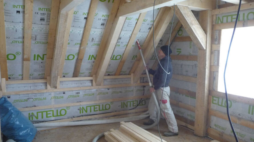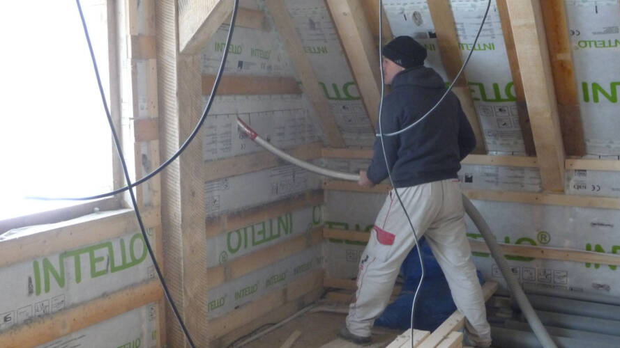 Zu den Vorteilen der Zelluloseeinblasdämmung gehört ihre Abfalllosigkeit und perfekte Ausfüllung des Raums.
