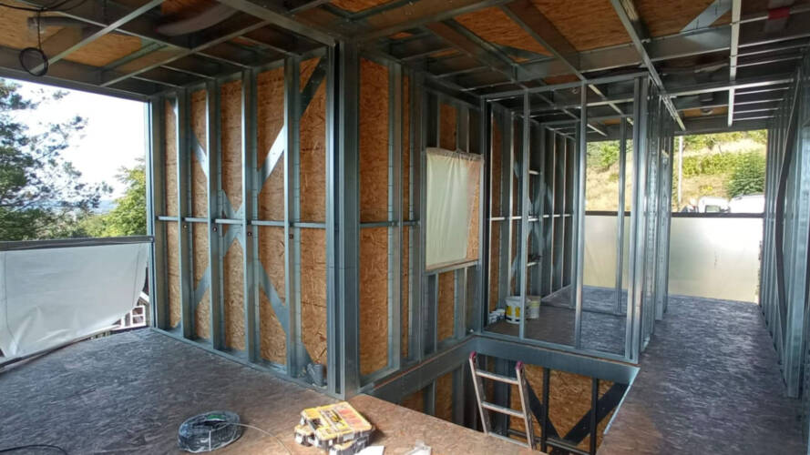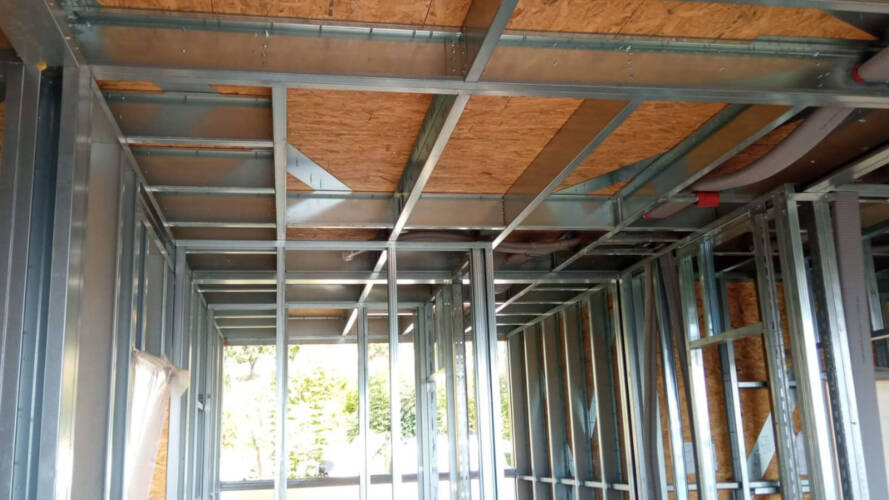 Výhodné je použití instalační předstěny. Po aplikaci rozvodů se dřevěný rošt nastříká izolací, která výrazně zlepší akustiku a zvýší tepelný odpor konstrukce. Pokud je předstěna v tloušťce do 6 cm, není nutné řešit parobrzdnou rovinu (dostačující je OSB deska v obvodové stěně)díky přirozené schopnosti celulózové izolace aktivně transportovat vlhkost.