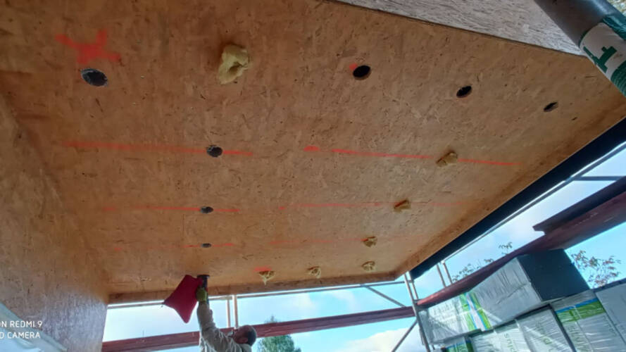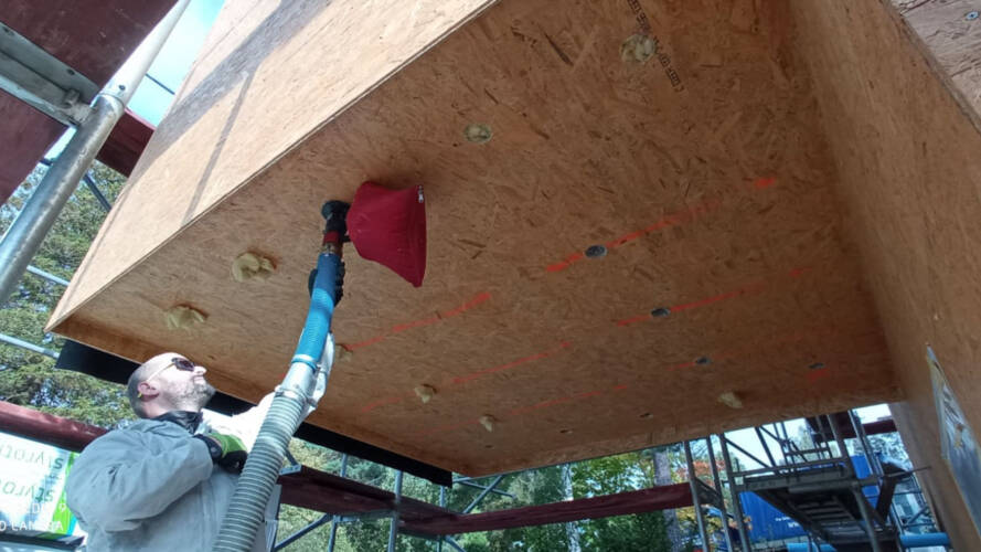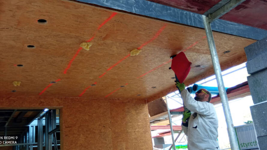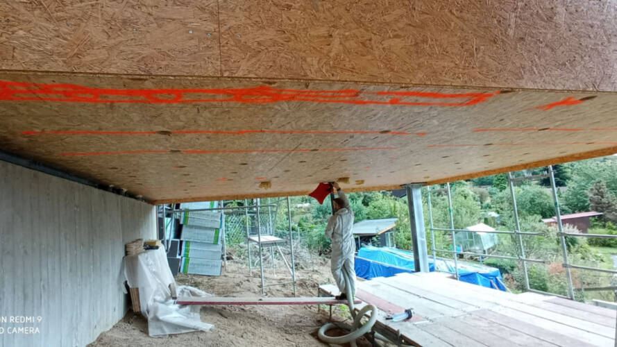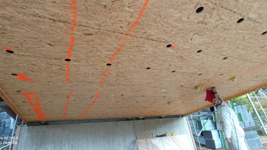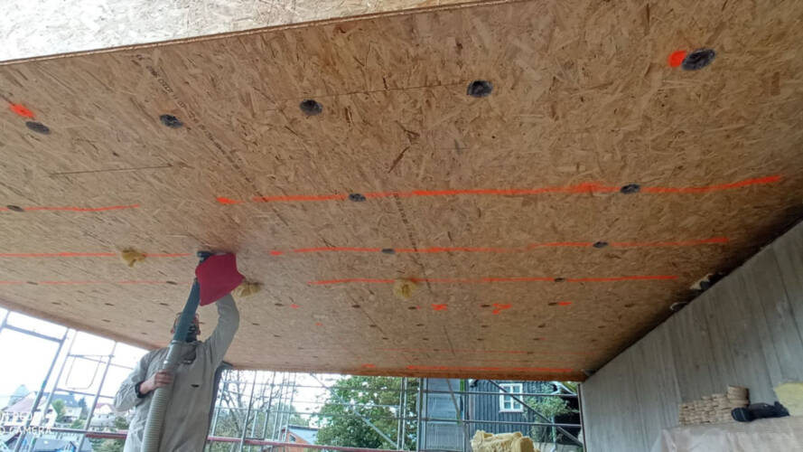 Celulózová izolace Climatizer Plus zajišťuje díky své objemové hmotnosti i dostatečný útlum zvuku, ale v určitých místech domu je nutné použít jiné řešení akustiky. Například ve skladbě trámového stropu se s výbornými výsledky používá i ultratenké akustické desky Wolf.