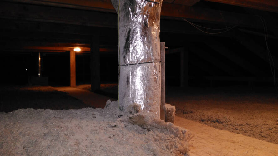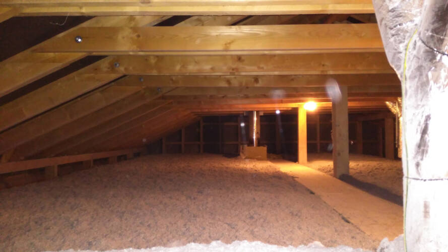 Celulózová izolace Climatizer Plus zajišťuje díky své objemové hmotnosti i dostatečný útlum zvuku, ale v určitých místech domu je nutné použít jiné řešení akustiky. Například ve skladbě trámového stropu se s výbornými výsledky používá i ultratenké akustické desky Wolf.