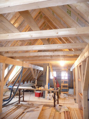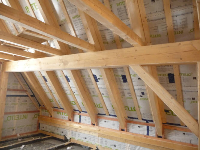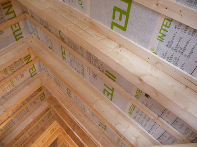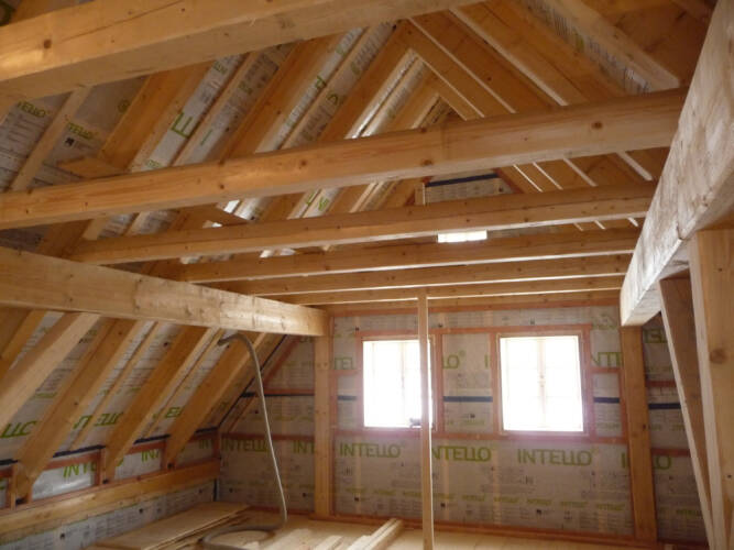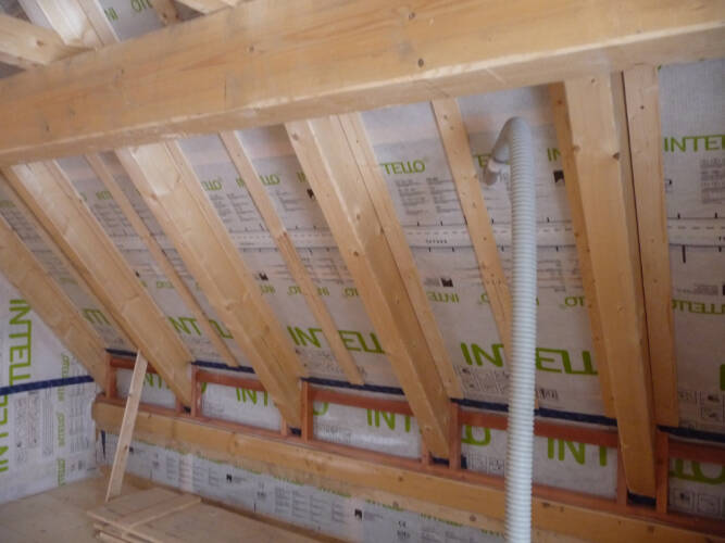 Celulózová izolace Climatizer Plus zajišťuje díky své objemové hmotnosti i dostatečný útlum zvuku, ale v určitých místech domu je nutné použít jiné řešení akustiky. Například ve skladbě trámového stropu se s výbornými výsledky používá i ultratenké akustické desky Wolf.