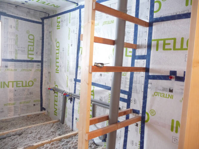 Výhodné je použití instalační předstěny. Po aplikaci rozvodů se dřevěný rošt nastříká izolací, která výrazně zlepší akustiku a zvýší tepelný odpor konstrukce. Pokud je předstěna v tloušťce do 6 cm, není nutné řešit parobrzdnou rovinu (dostačující je OSB deska v obvodové stěně)díky přirozené schopnosti celulózové izolace aktivně transportovat vlhkost.
